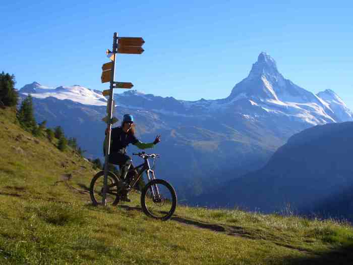 The second time I did better and the third time even rode most of it :-)… My arms and brakes needed a break, so chilling in the sun with the beautiful view to the Matterhorn…
