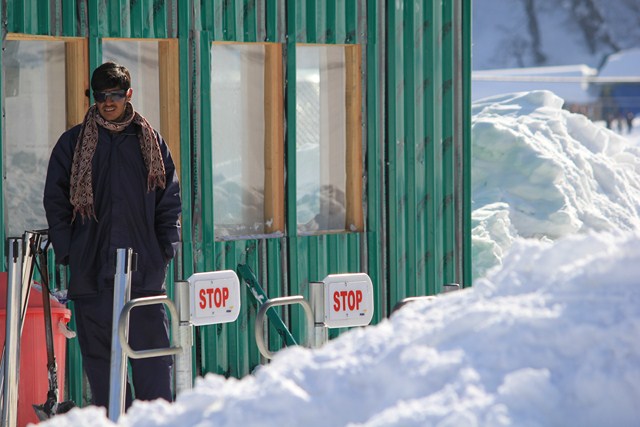 Mein letzter Tag in Gulmarg. Strahlend schön und sie hatten doch gestern alles zerbombt. Anscheinend nicht genug, denn die Gondel steht und es wird wieder gesprengt. Same procedure as usual, it’s a waiting game. Tea time an der Mittelstation… Gegen mittags wird dann die Gondel für Skifahrer freigegeben. Last turns in the Indian snow…