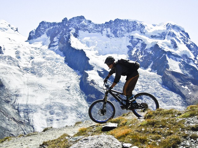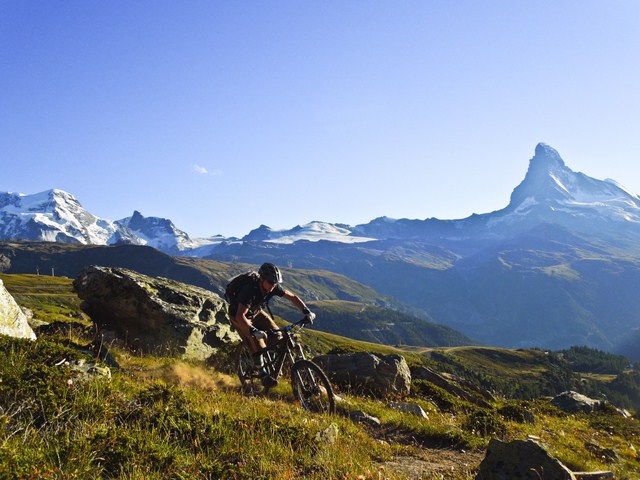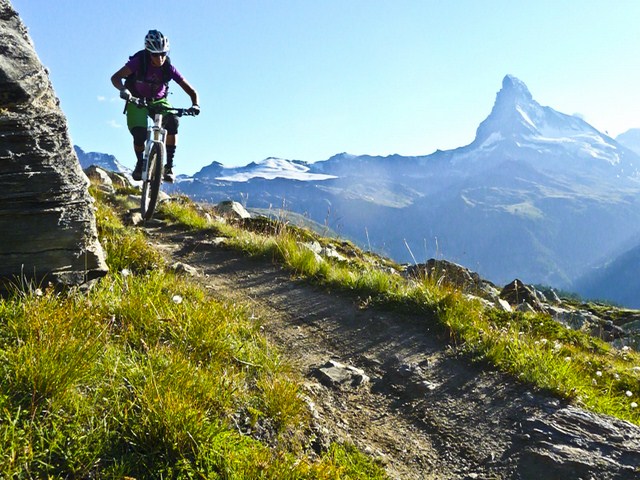My two favourite panoramatrails around Zermatt are the one’s from Gornergrat and “Trift”. Both are just to enjoy for experienced bikers, otherwise you have to toss and carry your bike for quite a while 😉 Gornergrat is easy accessible with the Gornergratbahn. Although the cost for just one ride is quite expensive (46 Swiss Francs for one way) is absolutely worth it! The panorama up there is just BEAUTIFUL! And the trails down there are AWESOME! Technical but rideable, flowy and always the Matterhorn in front of you… 1500 altitude meters downhill, not bad or?
