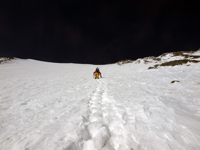Kept on climbing up that steep face… Tracks were already in there. But sank in the snow quite often. Warm temperature, soft snow but it got harder and harder.
