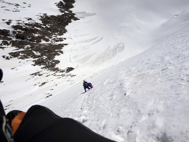 Climbed the few meters back down to the skis. Got ready and still wanted to wait a couple more minutes to give Liz the chance of putting on her skis. Didn’t want to bring all the sluff down on her. Lea was still waiting in the sun, waiting for us girls to come…