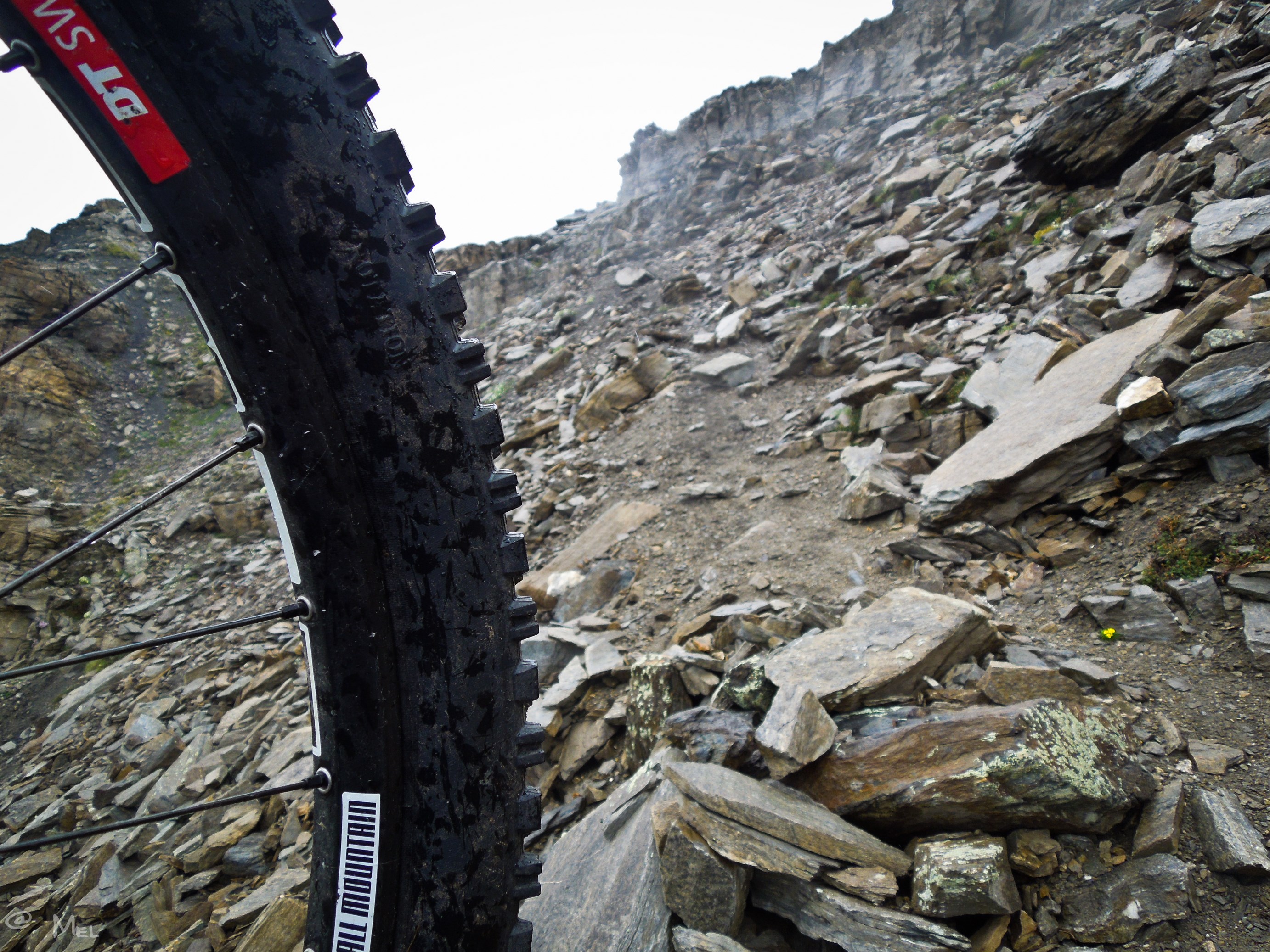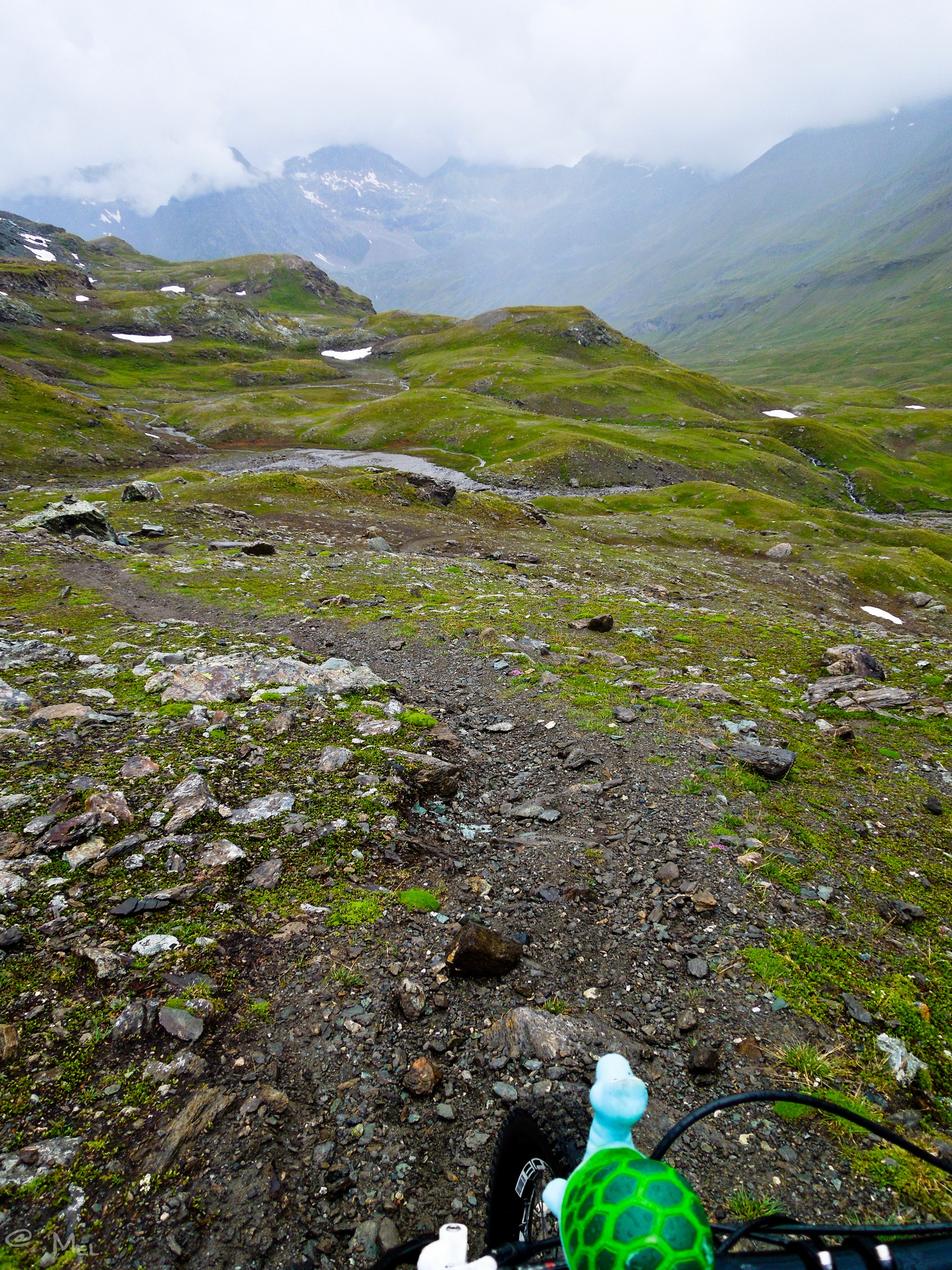 Die letzten 300 Höhenmeter zum Passo Invergneux auf 2902 m heißt es das Bike schieben und tragen. Endlich. Geschafft. Rechtzeitig als ich den Pass erreiche beginnt es zu regnen. Na bravo 😉
