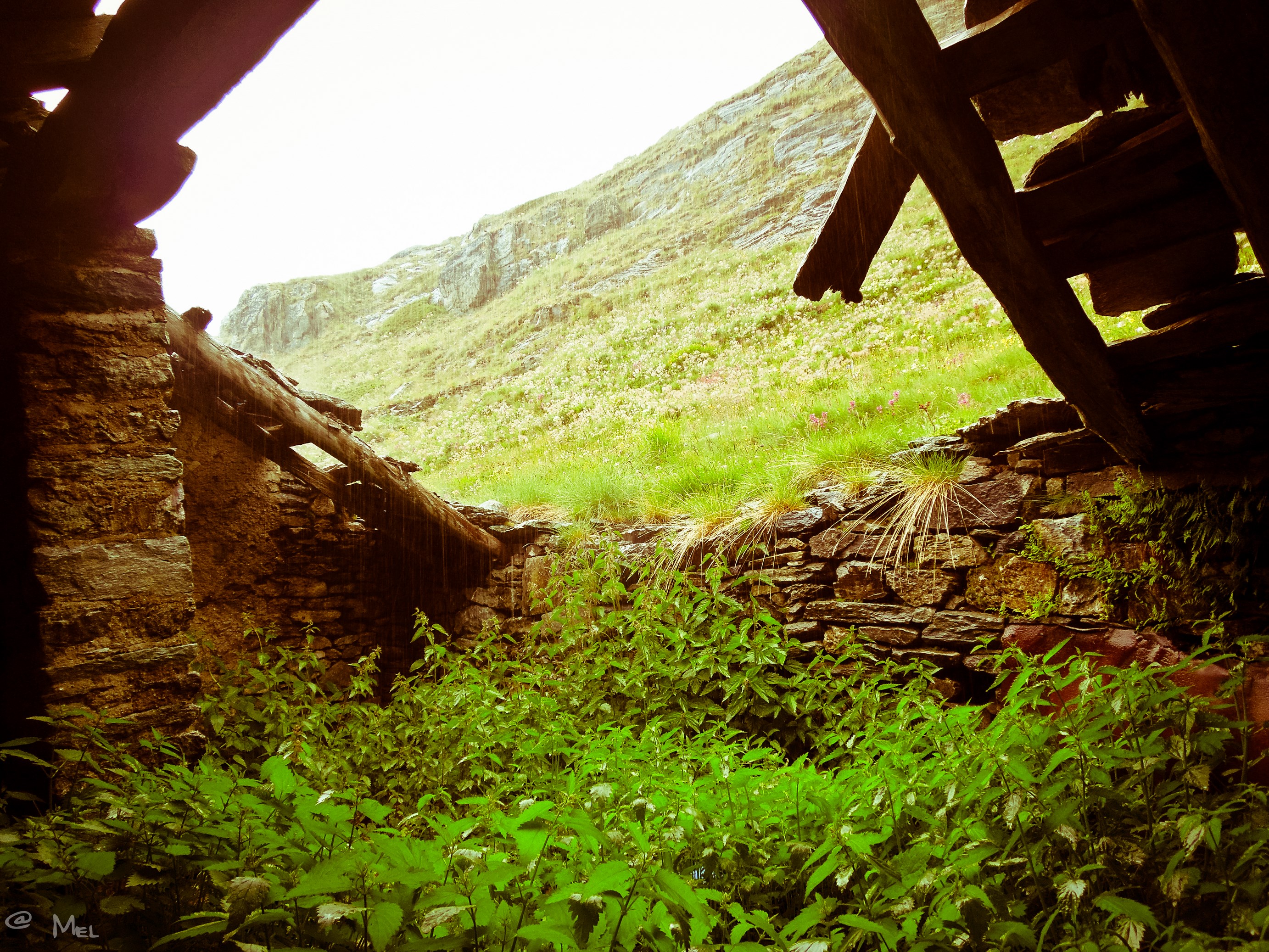 Ich erreiche ein verlassenes Almendorf und beschließe wegen des immer stärker werdenden Regens unterzustehen. Gute Idee…