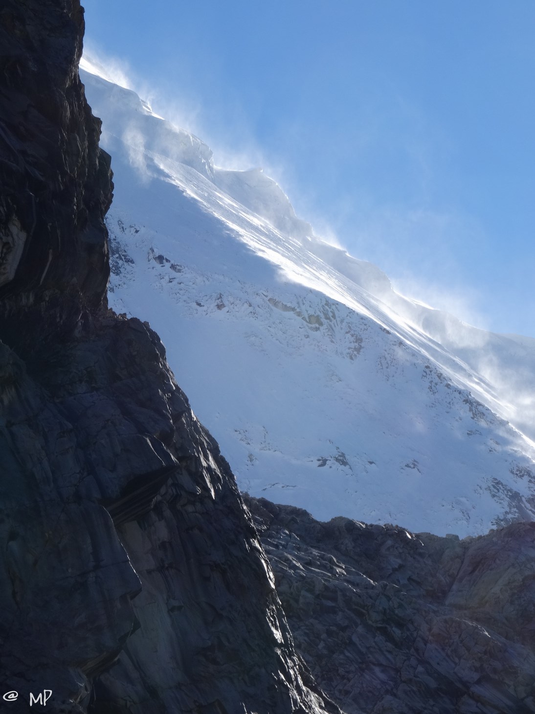 Wir sind ganz alleine unterwegs. Keine anderen Bergsteiger sind hier, nur wir, sonst niemand. Fast unglaublich. Die Umgebung ist surreal. Massive Gletscher und Berge rundherum, beeindruckend!