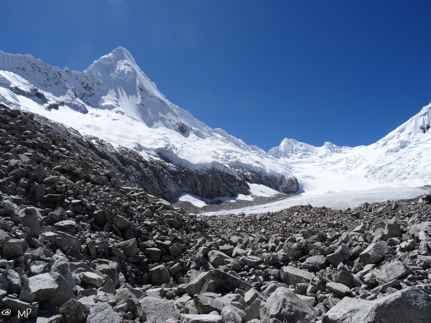 Bis ca. 9 Uhr haben wir geschlafen, bevor es gemütliches Frühstück in der Sonne gibt. Juhu, ein kleines Erfolgserlebnis: ich finde fließendes Wasser nur ein paar Minuten vom Basislager entfernt. Dies erspart uns nun mühsames Wasser holen im unwegsamen Gelände. Gegen 11 Uhr brechen wir mit unserem Material auf. Wir wollen uns den Artesonraju aus nächster Nähe ansehen und den Routenverlauf auschecken. Eine dreiviertel Stunde geht es über den massiven Geröllhaufen der Moräne, bevor wir am Gletscher unsere Ski anschnallen und auffellen können..