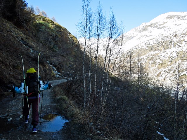 Bin doch etwas verwundert dass gar kein Auto hier parkt? Bin ich wirklich ganz allein? Mit Sack und Pack wandere ich ca eine Stunde taleinwärts bis ich nach Bachdurchquerung und Turnschuhdepot endlich mit Fellen weitermarschieren kann. Die heavy load am Rücken (Rucksack, Ski, Skischuhe, etc) ist immer hardcore, umso angenehmer geht es nun voran. Bis auf ein paar Murmeltiere ist hier keine Menschenseele unterwegs.