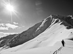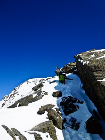 There are quite a few possibilities to climb and ski the peak. One possibility is to skin all the way up along the east side or the more adventurous line is to climb the northern ridge. Therefore it is recommended to be an experienced mountain person otherwise you shouldn’t go that way! There are some really challenging bits where climbing/mountain skills are a must! We had our crampons in the backpack, were able to climb everything without them…