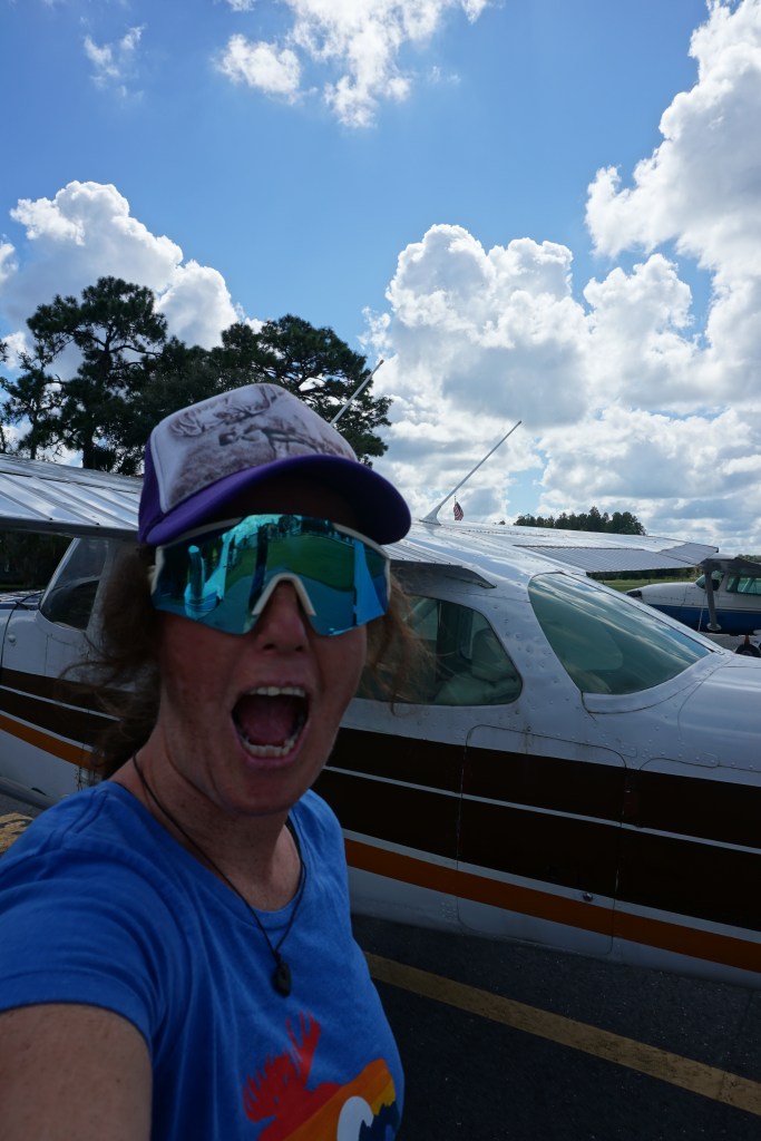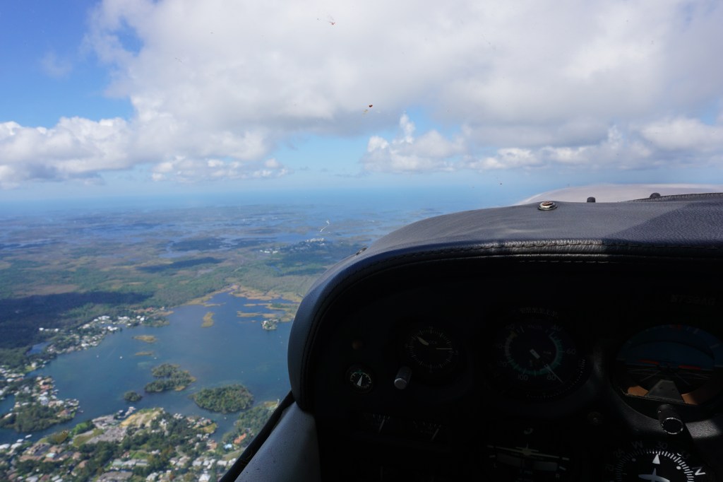 I organized an intro flight at Crystal River Airport with Patrick, who has been a professional CFI/Certified Flight Instructor for many years. It was October 2021, a clear, sunny and hot day, great for flying. Before taking off, we did a pre-flight inspection, checking if the airplane is airworthy. He explained me everything I had to take care about and then off we went – wohooo, airborne. So overwhelming but at the same time lots of fun.